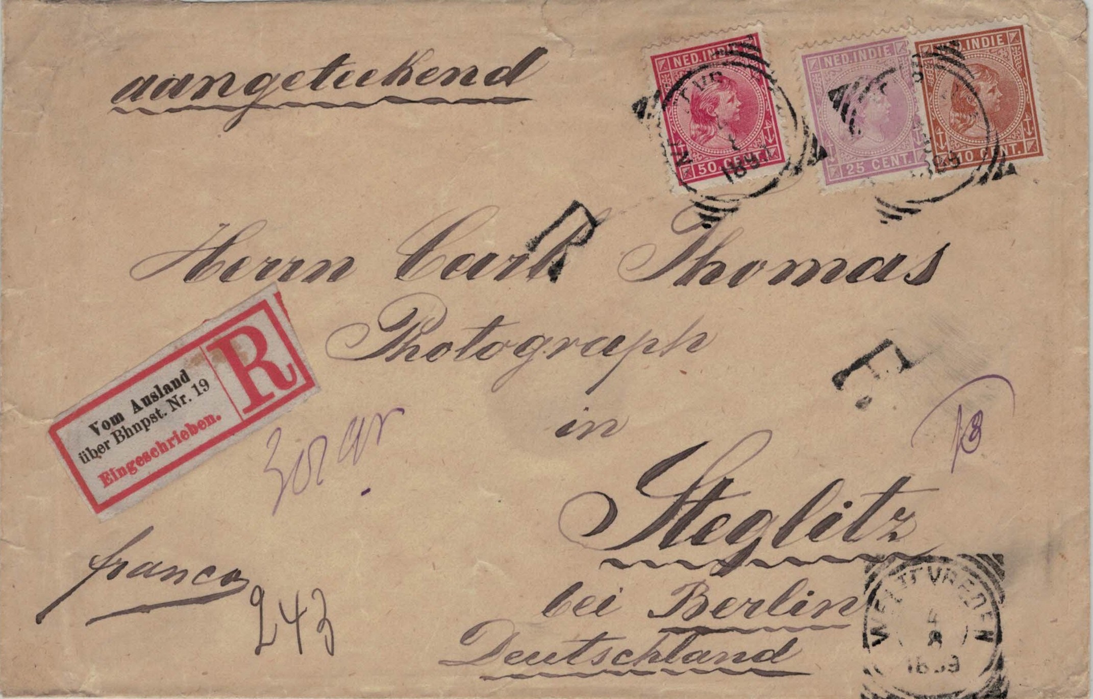 Dekorativer Einschreibebrief von Weltevreden (damals Vorstadt von Batavia – heute Jakarta) nach Steglitz bei Berlin vom 4.8.1899. Der Brief ist frankiert mit insgesamt 85 Cent der Prinzessin Wilhelmina-Ausgabe von 1892-97. Das Porto berechnete sich für diesen 38 Gramm schweren Brief wie folgt: Brief in die UPU Länder vom 1.5.1877 bis 28.2.1907 für 30 – 45 Gramm: 3 x 25 Cent = 75 Cent + Einschreibegebühr 10 Cent = 85 Cent.