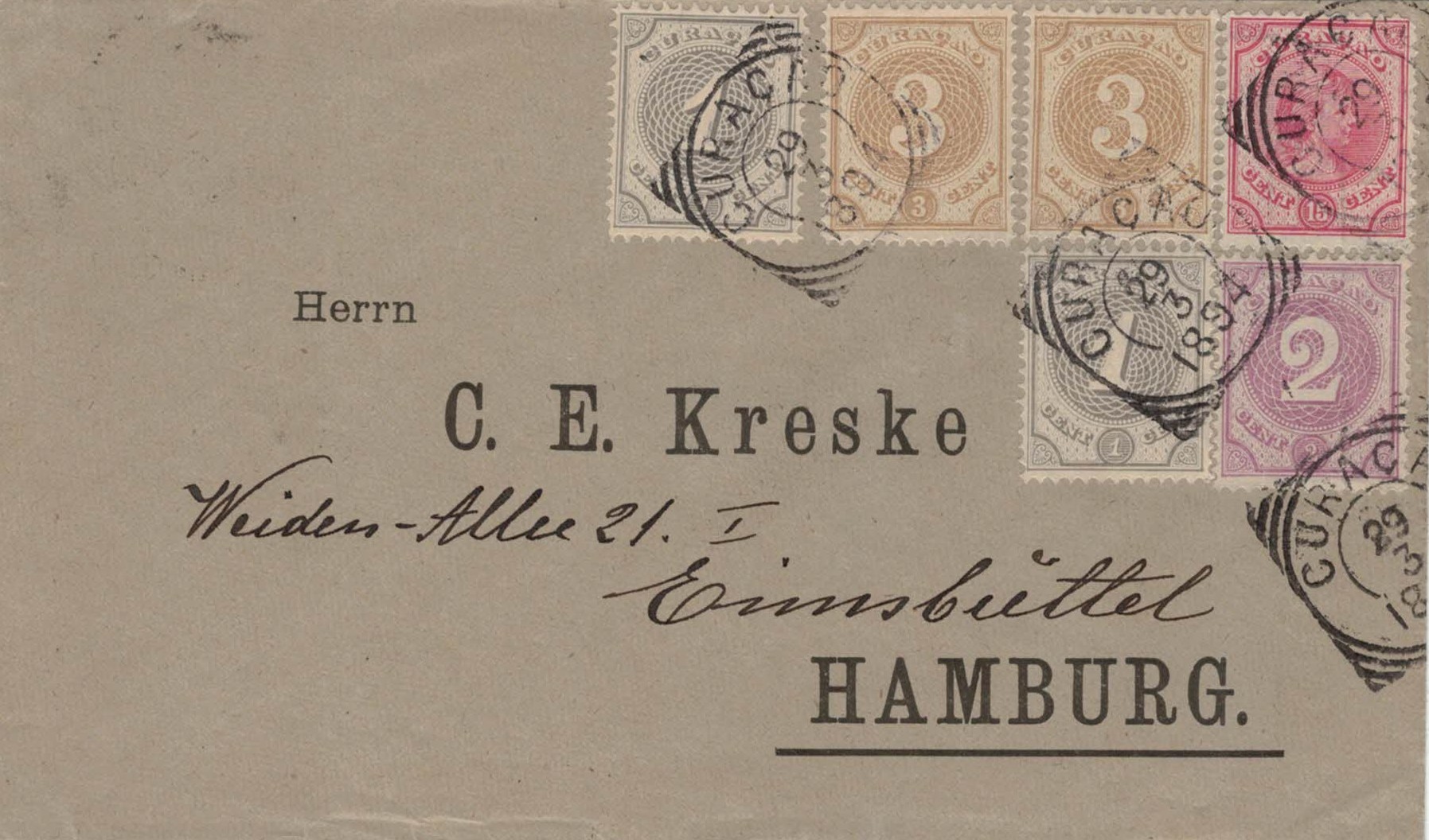 Brief vom 29.3.1894 von Willemstad (Curaçao) nach Hamburg, frankiert mit 25 Cent, welches das korrekte Porto nach Übersee zu dieser Zeit war.